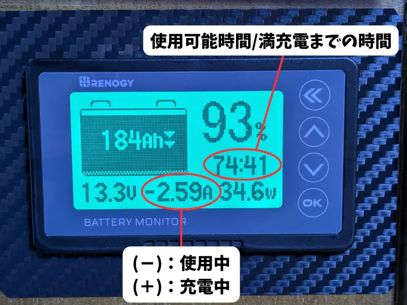 画面中央に残量の%表示があり、下段の数字が(マイナス)は電気を使用中・(プラス)の場合は充電中を表しています。